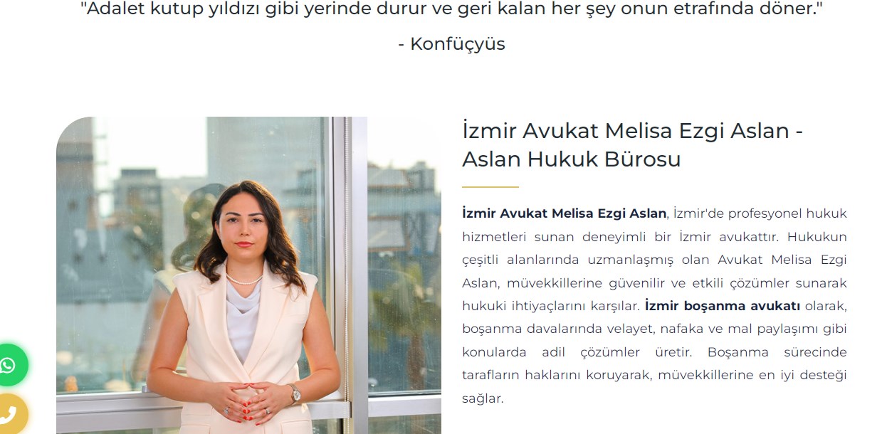Melisa Ezgi Şimşek Avukatlık Bürosu bu alanda İzmir’de güvenilir bir hukuk desteği sunmaktadır. Büro, boşanma hukuku, aile hukuku, miras hukuku ve diğer hukuk dallarında müvekkillerine profesyonel hizmet verir. Her dava, özel bir dikkat ve strateji gerektirdiğinden, her müvekkilin durumu ayrı değerlendirilir ve kişiye özel hukuki çözümler sunulur.
